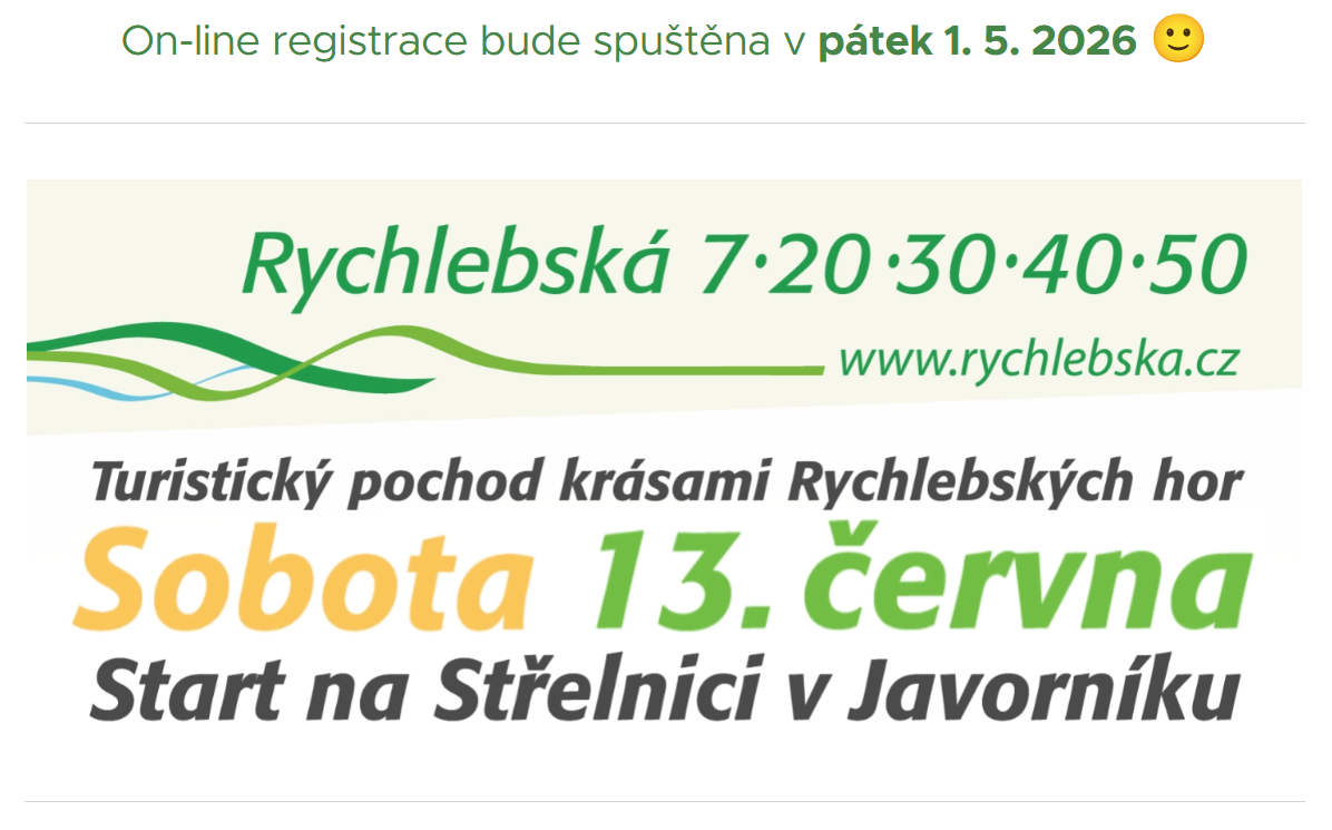 Od pátku 1. 5. 2026 do neděle 7. 6. 2026 bude možné se na akci registrovat on-line. Pokud byste náhodou datum nestihli, nevadí, rádi vás zaregistrujeme v den konání akce přímo na Střelnici. Těšíme se na vás a POTKÁME SE NA RYCHLEBSKÉ 13. 6. 2026!